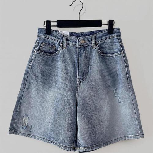 [신상오픈런]여성 스크래치 디스트로이드 워싱 와이드 버뮤다 청반바지 (37001396)