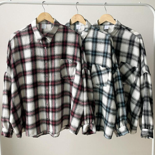 [옷자락]여성 루즈핏 힙 덮는 퍼프 소매 긴팔 체크 카라 셔츠