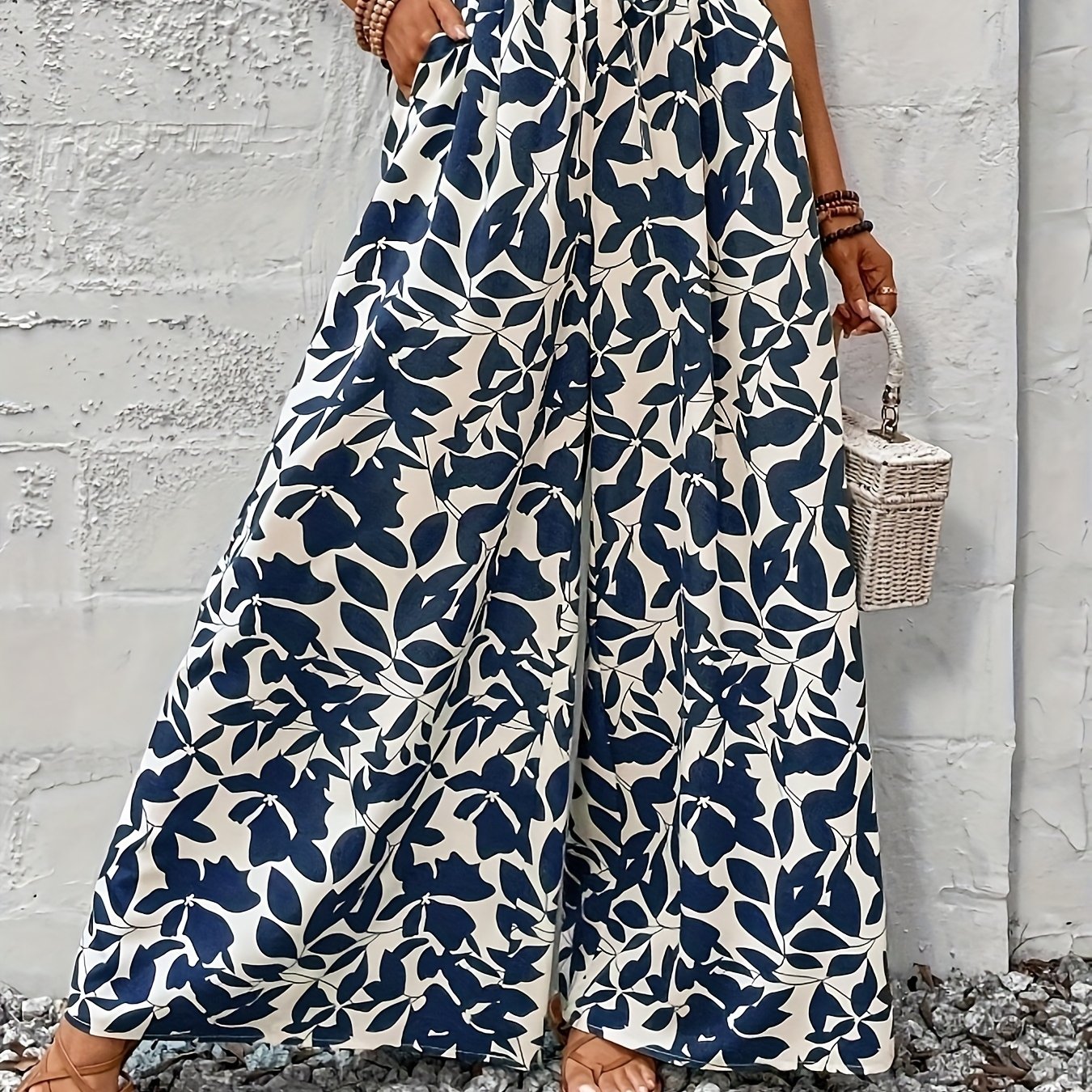 TEMU 여름 우아한 시크 로맨틱 여성 프린트 러플 허리 라인 와이드 레그 캐주얼 루즈한 바캉스 트라우저 페이크 드로스트링 캐주얼 스타일