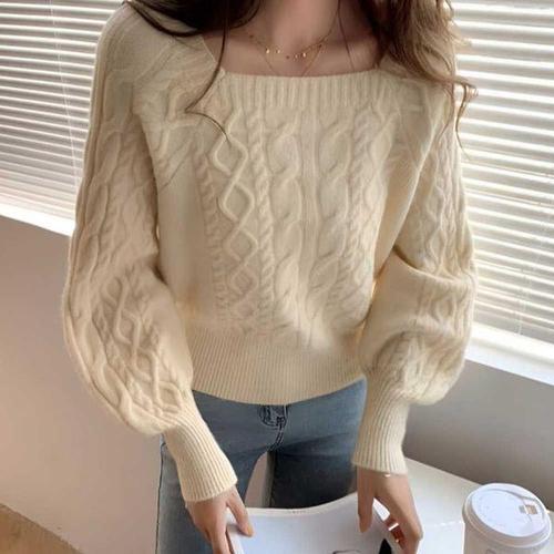 여성 벌룬 반소매 스퀘어넥 골지 숄더 니트웨어