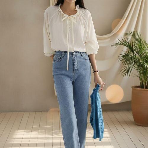 [다잇템]여성 비침 소매 리본 블라우스 벌룬 잔단추 봄