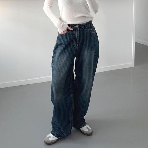 [신상오픈런]여성 스트라이프 워싱 저지 로우라이즈 벌룬 와이드 진