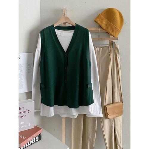 [샵앤]여성 V넥 A라인 비조버클 니트 조끼 DGB-WVS-4930-그린