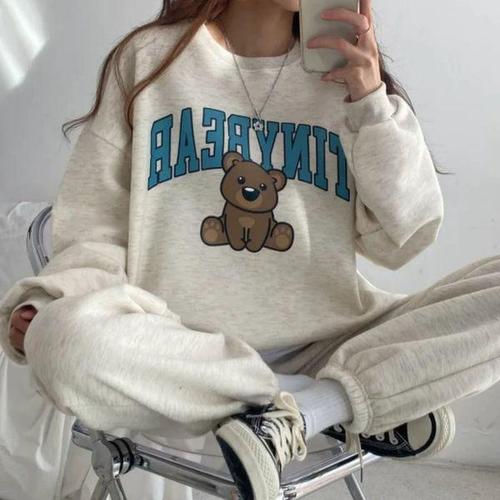 박스 오버핏 전사 케어 귀여운 베어 곰돌이 긴팔 와이드 긴바지 트레이닝 세트 국산