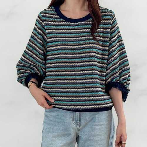 옷자락 / 여성 레이스 벌룬 7부 배색 스트라이프 링거 루즈 티