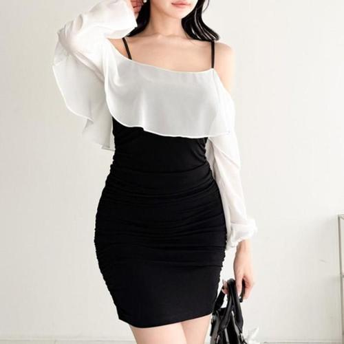 [신상오픈런]여성 오프숄더 미니 원피스 쉬폰 배색 셔링 스타일 (41566410)