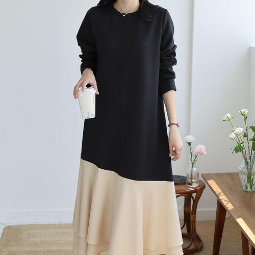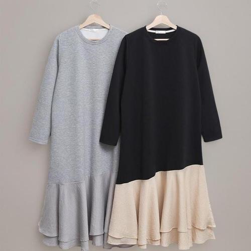 [유야]링클프리 배색 프릴 긴팔 플레어 롱 원피스 하객룩 -OP0164H- 빅사이즈 루즈핏 여성 봄