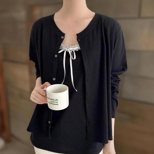 [신상오픈런]여자 레이스 배색 리본나시 박시 라운드 가디건 세트 (41432358)