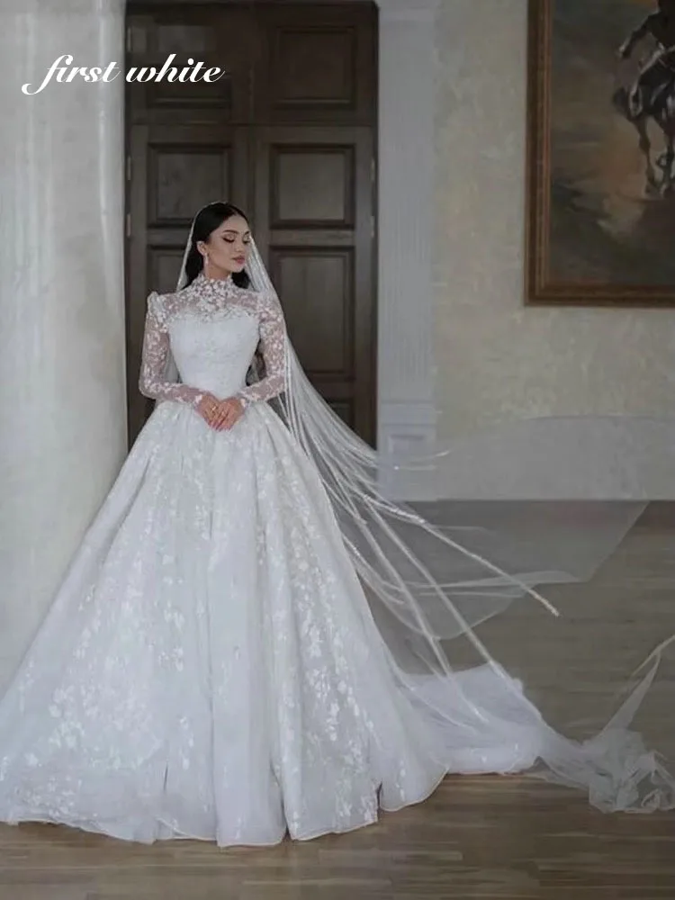 럭셔리 긴팔 웨딩 드레스, 하이 넥 로브, 맞춤형 아플리케, 레이스 컨트리 신부 가운