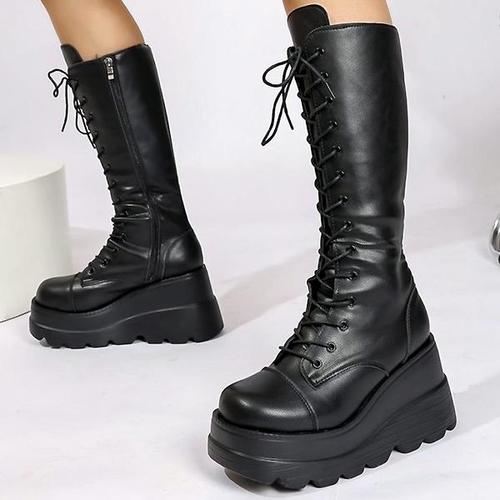 블랙 여자 레이스업 워커 통굽 부츠 키높이 겨울신발