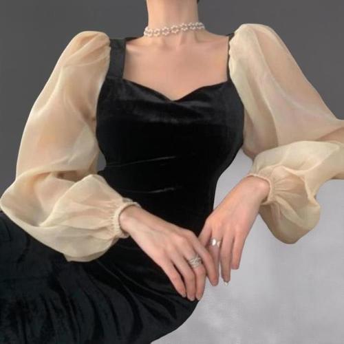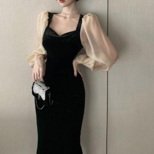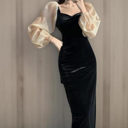 [신상오픈런]여성 슬림핏 롱 원피스 벨벳 쉬폰 퍼프소매 레이어드 드레스 (42003912)