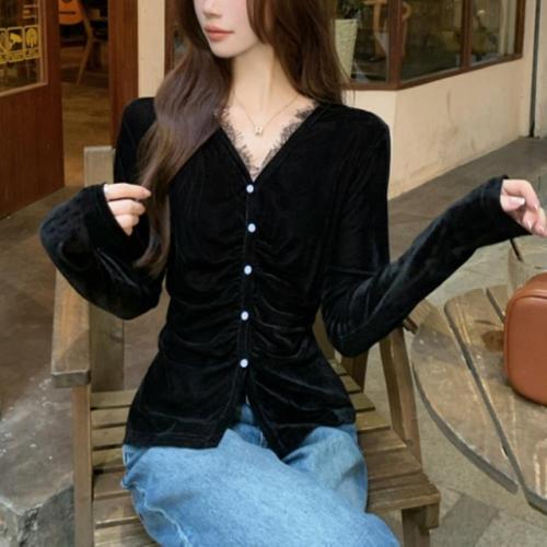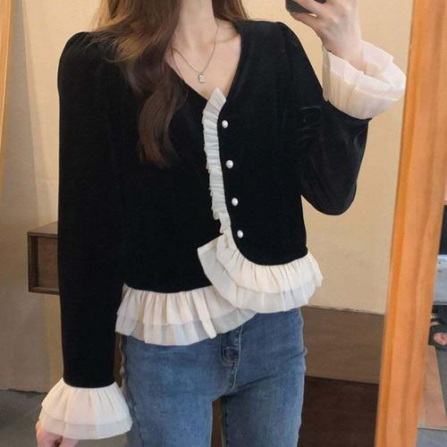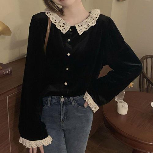 [옷자락] 여자 레이스 브이넥 슬림 셔링 벨벳 긴팔 블라우스