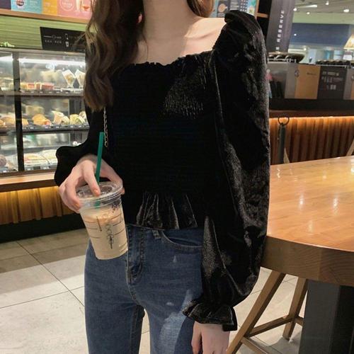 COSYEVNO 여성 벨벳 블라우스 가을 패션 언밸런스 퍼프 소매 트임 긴팔 상의 lyjsrtx06