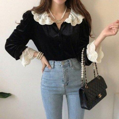 [페리엠]배색 빅카라 레이스 벨벳 베릴수블라우스