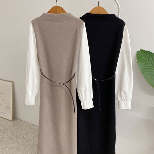 허니제이 / 벨트세트 플레코 셔츠 소매 니트 롱 원피스(2color)