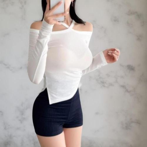 [옷자락]여성 슬림핏 오프숄더 스트랩 트임 언발란스 긴팔티셔츠