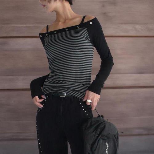 [신상오픈런]여성 오프숄더 스트랩 아일렛 스트라이프 배색 긴팔 티셔츠