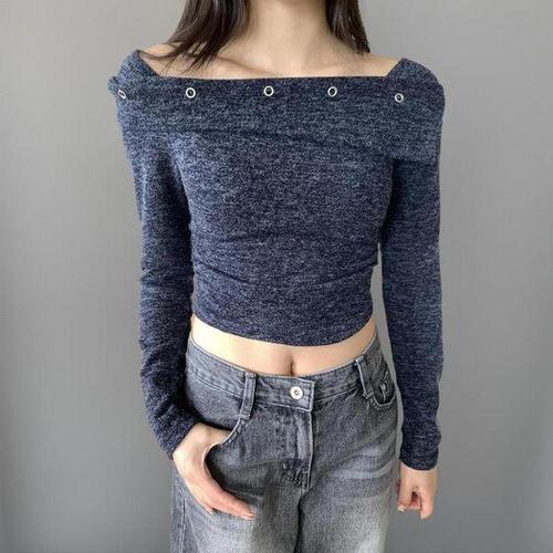 [옷자락]여성 심플 레이온 오프숄더 버튼 크롭 긴팔 티셔츠