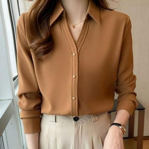 2025 봄/여름 트렌디 여성 블라우스 - 긴팔 V넥 단색 셔츠 - 세련된 오피스룩