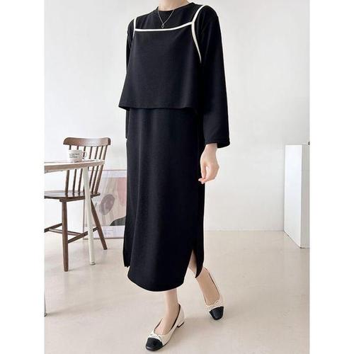 [샵앤]국산 여성 라운드 일자 미디 원피스 뷔스티에 세트 ARA-WSET-4953-블랙