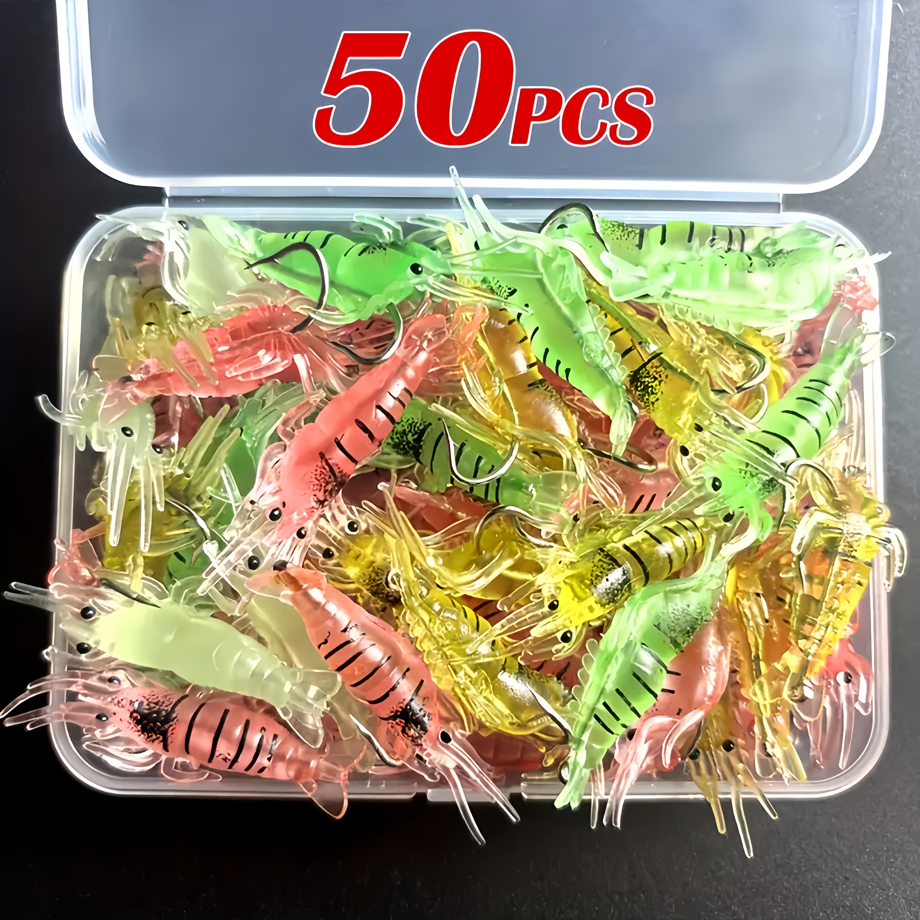 TEMU 50/100개 실리콘 새우 미끼 후크 포함 - 야간 낚시용 발광 소프트 루어, 혼합 색상 그린, 옐로우, 핑크, 발광 컬러, 아웃도어 낚시 액세서리, 낚시 루어