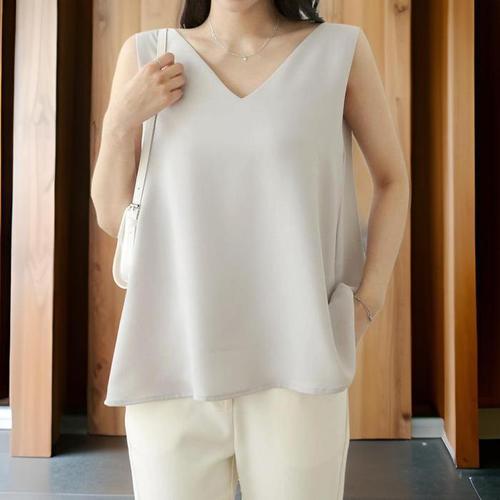 여자 루즈핏 실키 브이넥 민소매 슬리브리스 블라우스