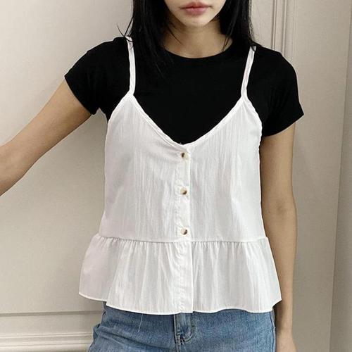 슈팅스타 / 셔링 프릴 캉캉 브이넥 시스루 나시 티 블라우스