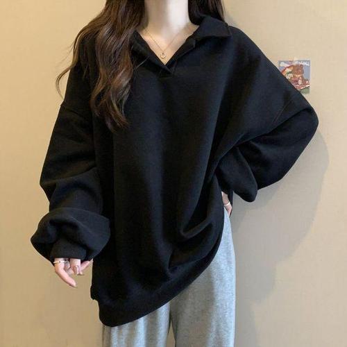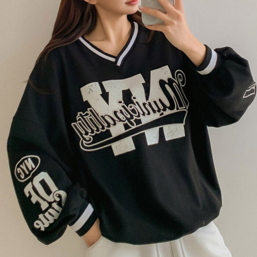 데일리앤 하인트 여성 루즈핏 나그랑 라벨 패치 브이넥 긴팔 쭈리 맨투맨 티셔츠 봄 가을 간절기
