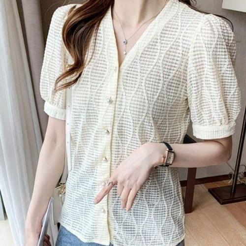 여성 슬림 핏 버블 반팔 블라우스, 우아한 통근자, 단색 딥 브이넥 셔츠, 여름 캐주얼 상의, 스위트 스타일