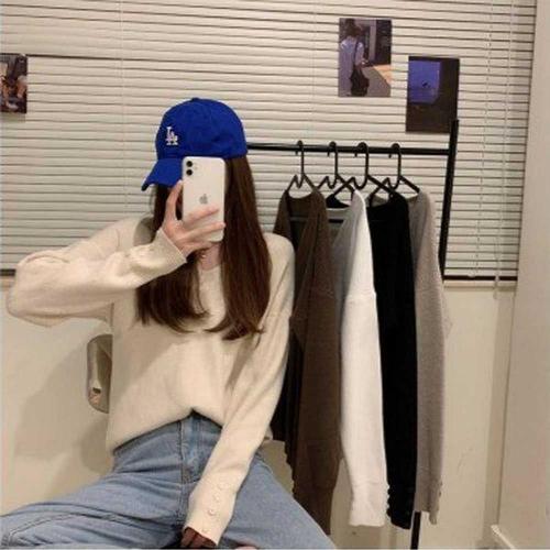 [에이치플러스몰]소매단추 포인트 긴팔 골지니트 브이넥 캐주얼 봄가을