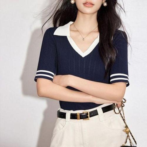 [에이치플러스몰]브이넥카라 골지니트 캐주얼 반팔티 여자 필수템 여성
