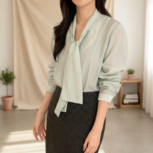 [다잇템]여자 보우 롱슬리브 슬림핏 V넥 블라우스