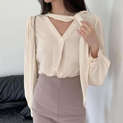 [신상오픈런]여성 기본핏 V넥 꼬임 롱슬리브 오피스룩 블라우스