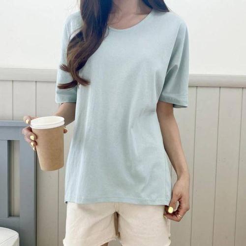 티류으스 빅사이즈 날씬해 보이는 어깨트임 여성복 여름 반팔티 루즈핏 캐주얼 심플 브이넥 티셔츠 스타일리쉬한 무지 미들 슬리브 톱