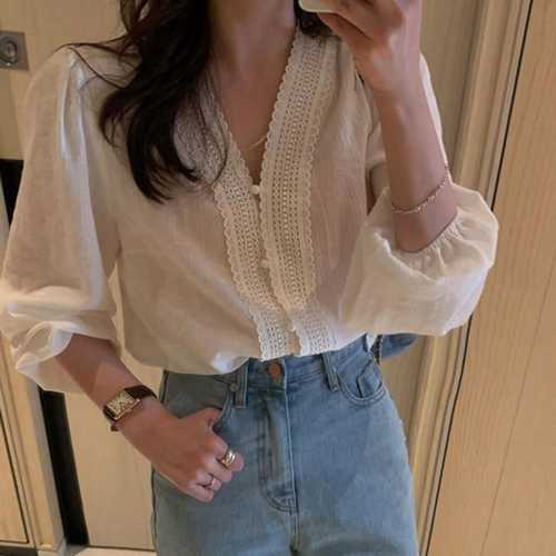 슈팅스타 / 심플 브이넥 레이스 포인트 베이직 셔츠
