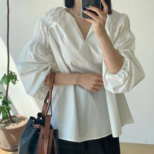 슈팅스타 / 쉬크 프렌치 플리츠 V넥 루즈 롱슬리브 셔츠