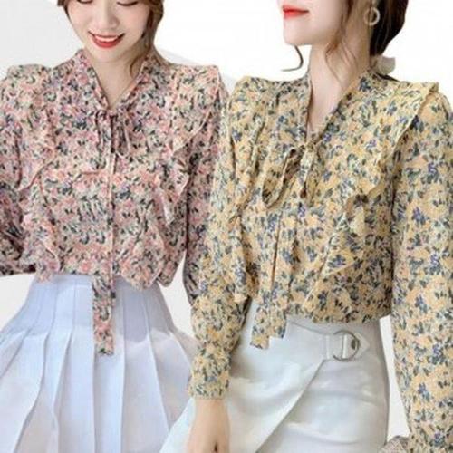 [셀러허브_여성트랜드패션]여성 반팔 브이넥 블라우스 돌잔치 휴가 셔츠 긴팔 휴양지 프릴