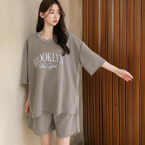 [신상오픈런]여성 루즈핏 브이넥 반팔티와 레터링 반바지 홈웨어 세트 (32331017)