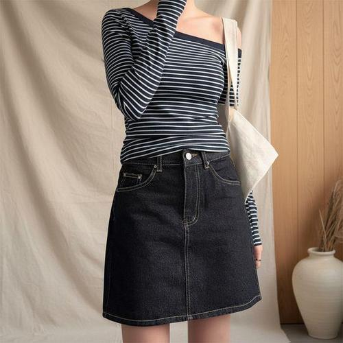 [옷자락]여성 블랙 A라인 스티치 미니스커트 논스판 면청치마