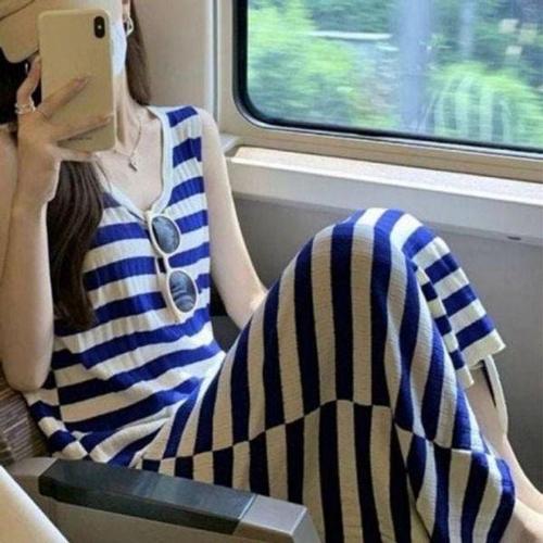 [모노무드]모노무드 블루 스트라이프 끈나시 스퀘어넥 롱 원피스