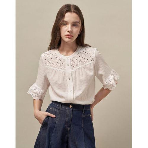 정상가 89000원ㅣ페미닌 펀칭 버튼업 프릴 긴팔 블라우스 (GOCBA010D)
