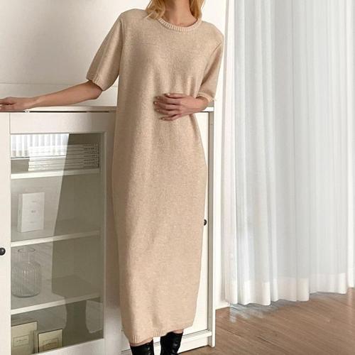 에르디테 / 여성 라운드넥 루즈 오버 핏 5부 반팔 울 비스코스 니트 롱 원피스 3컬러