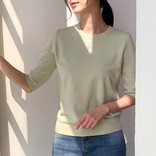 [드리다]여성 봄 라운드 비스코스 슬림핏 5부 반팔 이너 니트 미시 캐주얼 하객 상견례 오피스룩