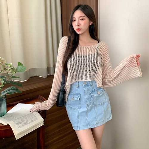 [신상오픈런]여자 펀칭 보트넥 시스루 커버업 비치웨어 긴팔 니트 (39079627)
