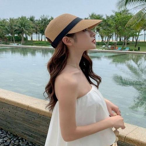 [에이치플러스몰]여름 모자 라피아햇 리본 포인트 비치캡 여성용 선캡 바캉스 햇빛 가리개 모자