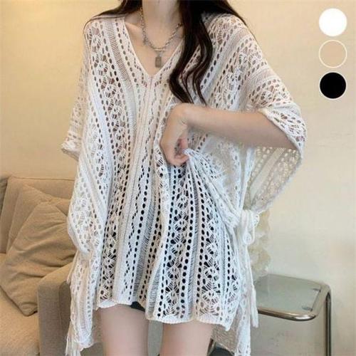 [에이치플러스몰]V넥 스웨터심플 비대칭 비치커버업