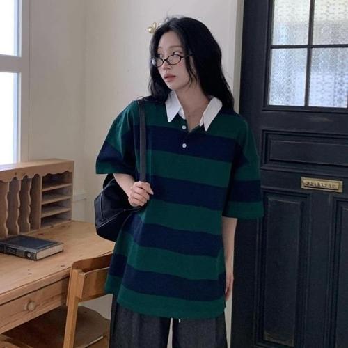 [다잇템][다잇템] 여성 카라넥 콘트라스트 오픈 반소매 줄무늬 빅사이즈 티셔츠_21570279_588872