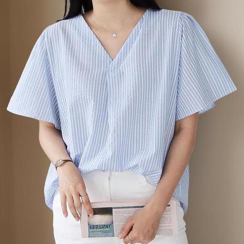 [신상오픈런]여성용 스트라이프 브이넥 빅사이즈 셔링 반팔 블라우스 (38284011)