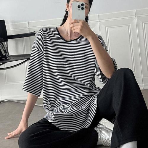 [신상오픈런]여성 빅사이즈 여름 단가라 루즈핏 반팔 링거 티셔츠 (33306242)