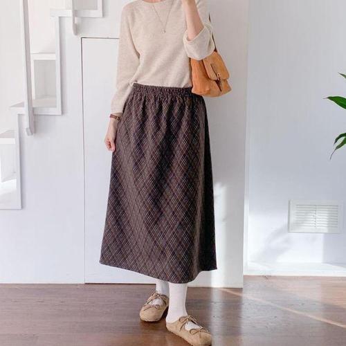 [옷자락] 여자 A라인 체크치마 울 밴딩 빅사이즈 슬릿 롱스커트